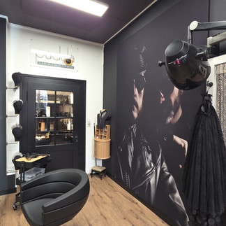 Das Haar-Atelier präsentiert sich als klar strukturierter, moderner Raum, in dem Kontraste gezielt eingesetzt werden, um eine elegante, ruhige Arbeitsatmosphäre zu schaffen.