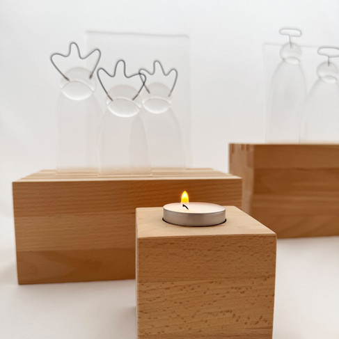 Die transparenten Körper fangen das Kerzenlicht ein und brechen es weich; so entsteht ein zarter Glanz, der die Szene lebendig wirken lässt. Einfache Drahtlinien formen Heiligenscheine, Hut und Kronen, die wie feine Zeichnungen im Raum stehen.